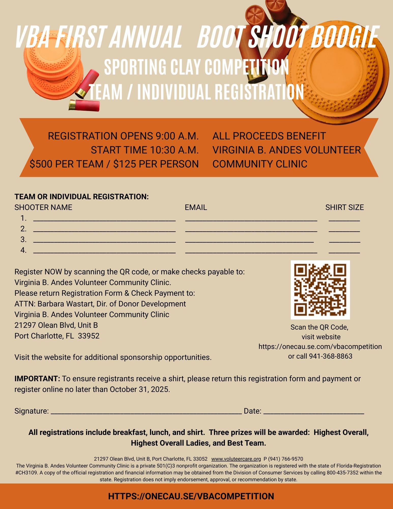The need for free quality healthcare continues to increase to meet the needs of residents in Charlotte County that have no insurance and are within 300% of the federal poverty level.  Virginia B. Andes Volunteer Community Clinic fills that gap, and with your help and support will continue to serve those needs.  We DO NOT receive any federal funding.  We ask that you join us for this event, and other fundraising activities to support our mission and together help us improve the health of individuals as well as our community as a whole.